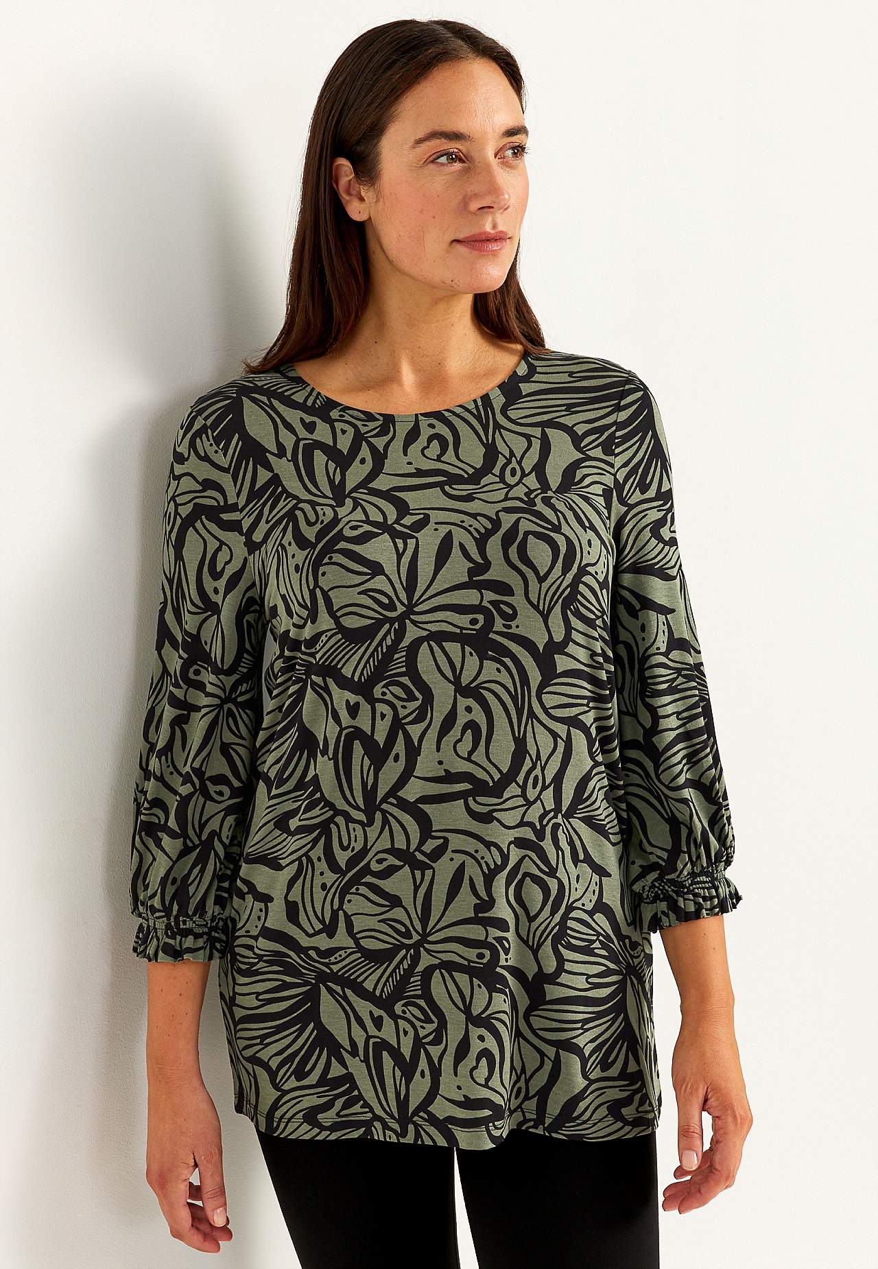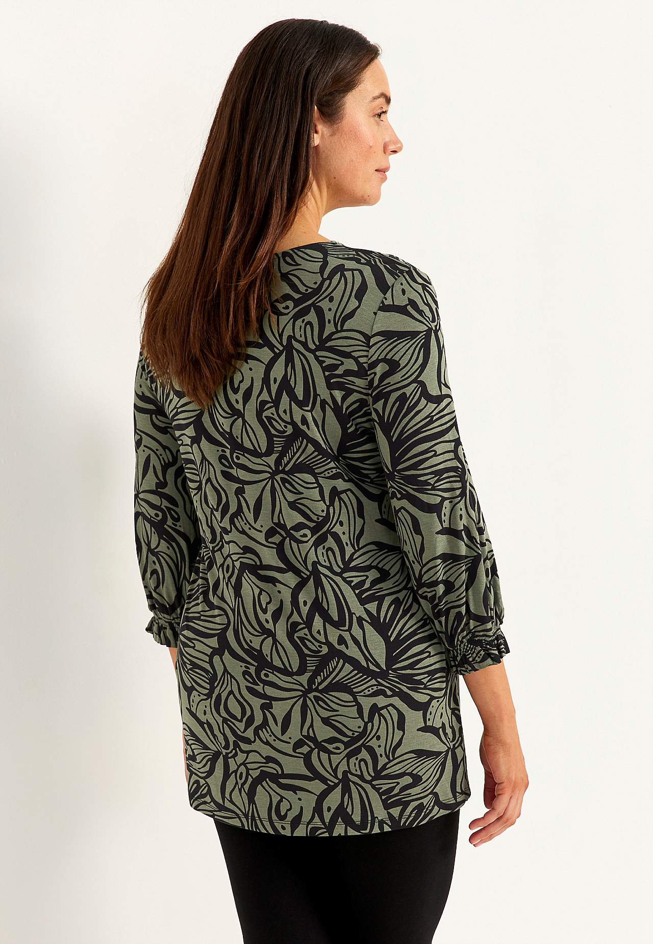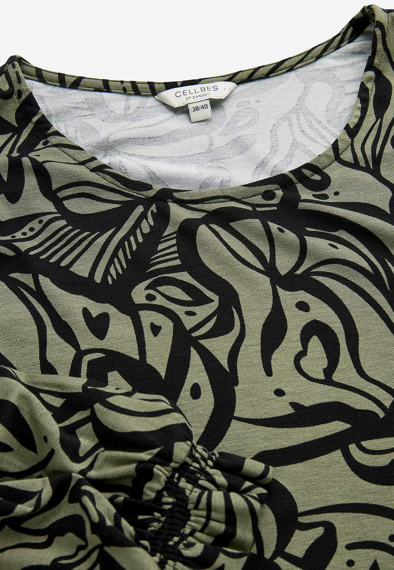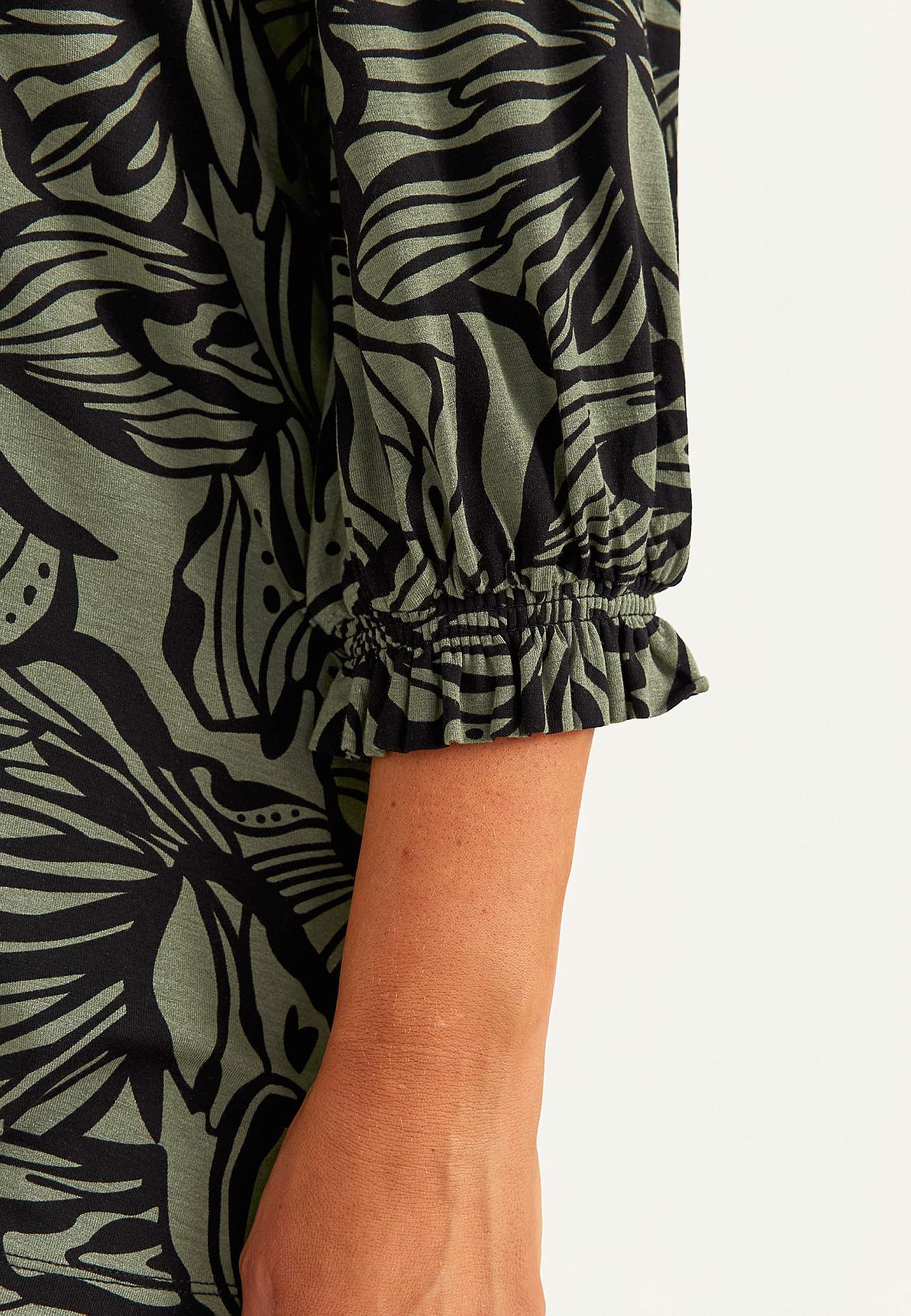 Hezké a těžké řasení. Klasický střih. Zaoblený krk. Široké rukávy s 3/4 délkou a nabírání na manžetách. Vzadu sedlo. Délka se odvíjí od velikosti, cca 73-80 cm od ramene.