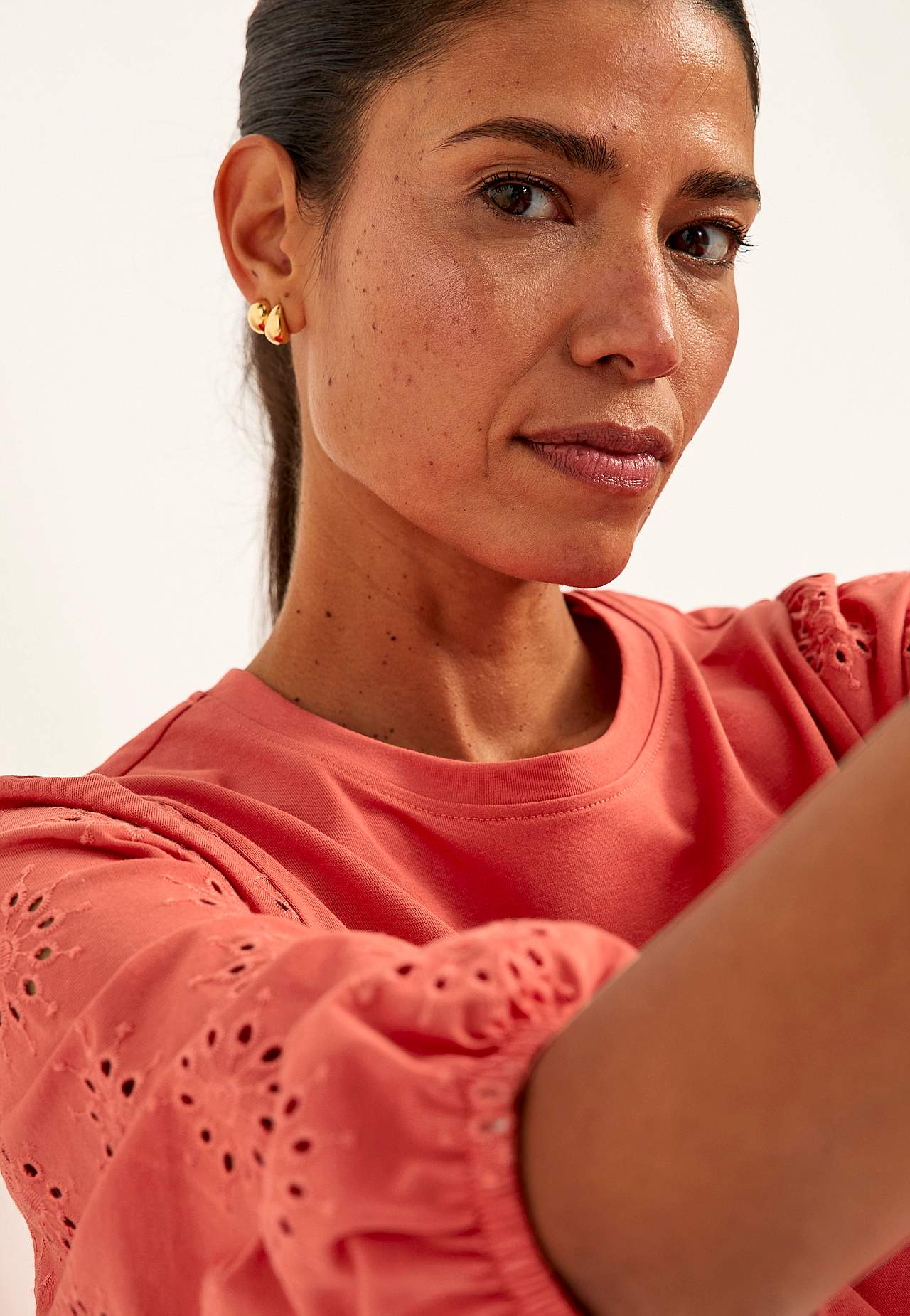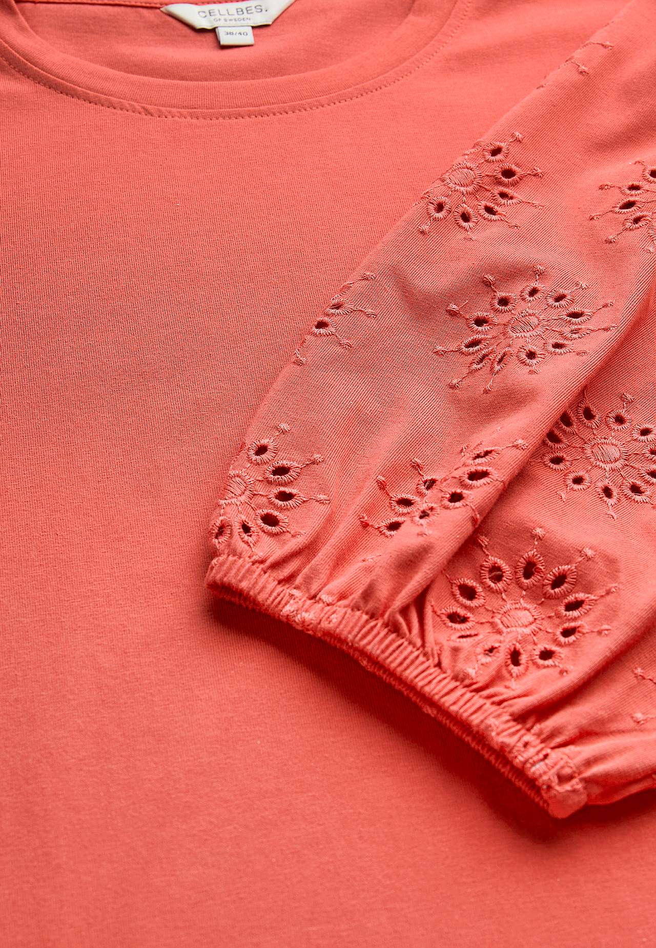 Tunika z mírně těžší a pevné směsi bavlny. Klasický střih. Výrazné nabírání na ramenou. Zaoblený krk. Široké rukávy s 3/4 délkou, propracovaným vzorem s anglickou krajkou a gumou na manžetách. Rovný lem. Délka zad se odvíjí od velikosti, cca 78-86 cm.