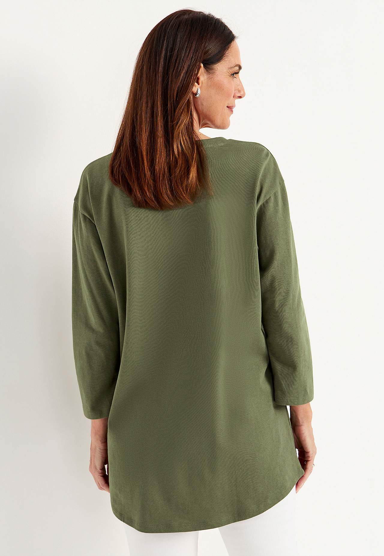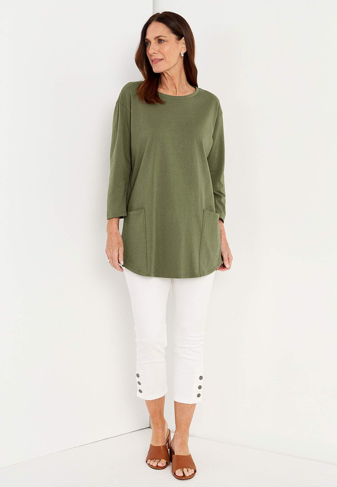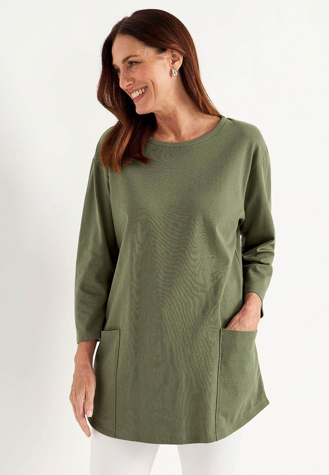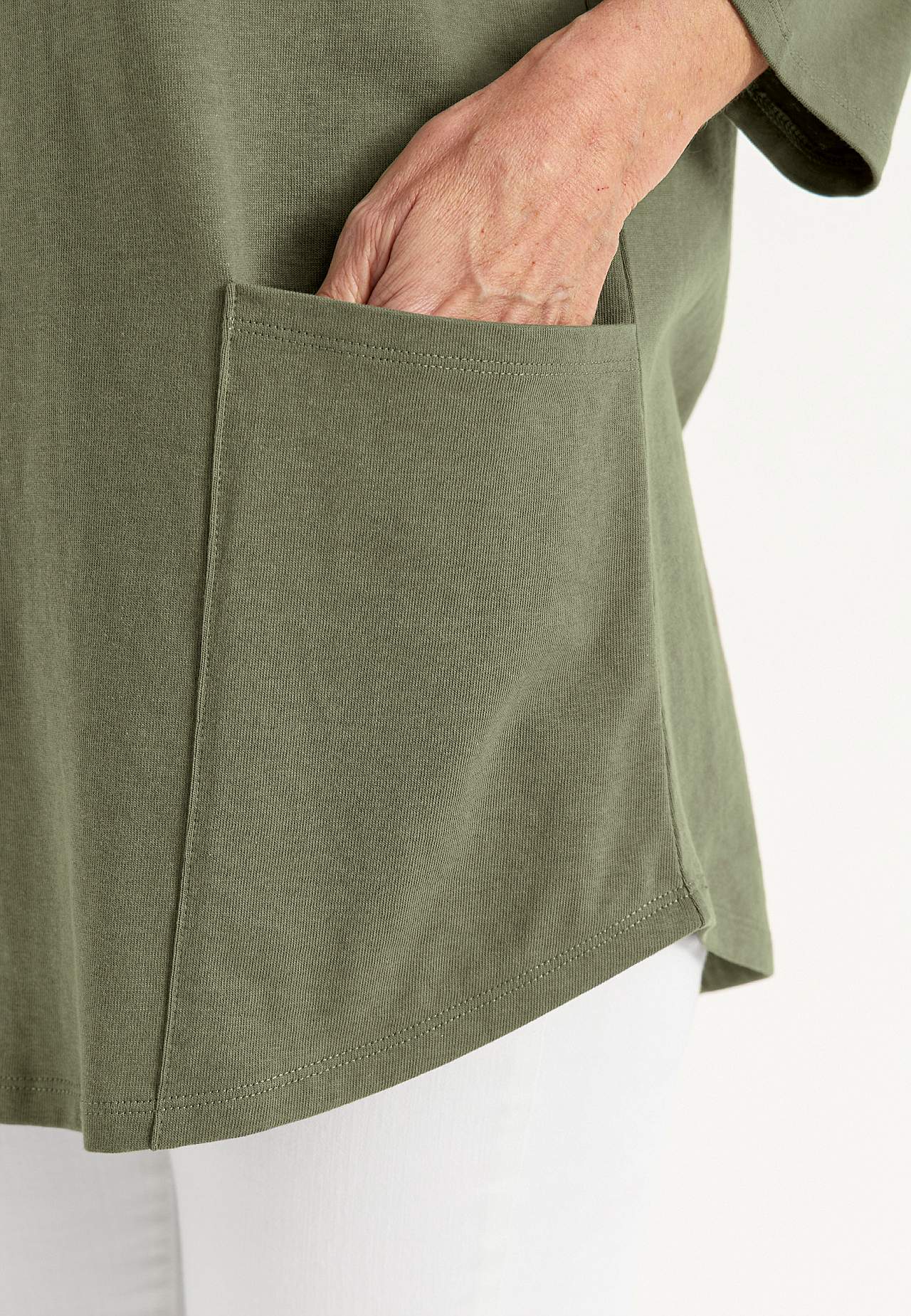 Tunikový top s pohodlnými a velkými kapsami. Měkká, pevná a mírně těžší kvalita. Oversized střih. Kulatý a žebrovaný výstřih. Spadlé rameno. Lehce širší rukávy s 3/4 délkou. Velké přední našité kapsy. Zaoblený lem. Vzadu sedlo. Délka se odvíjí od velikosti, cca 78-92 cm od ramene.