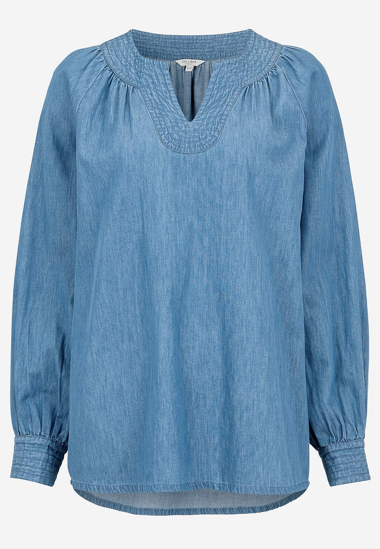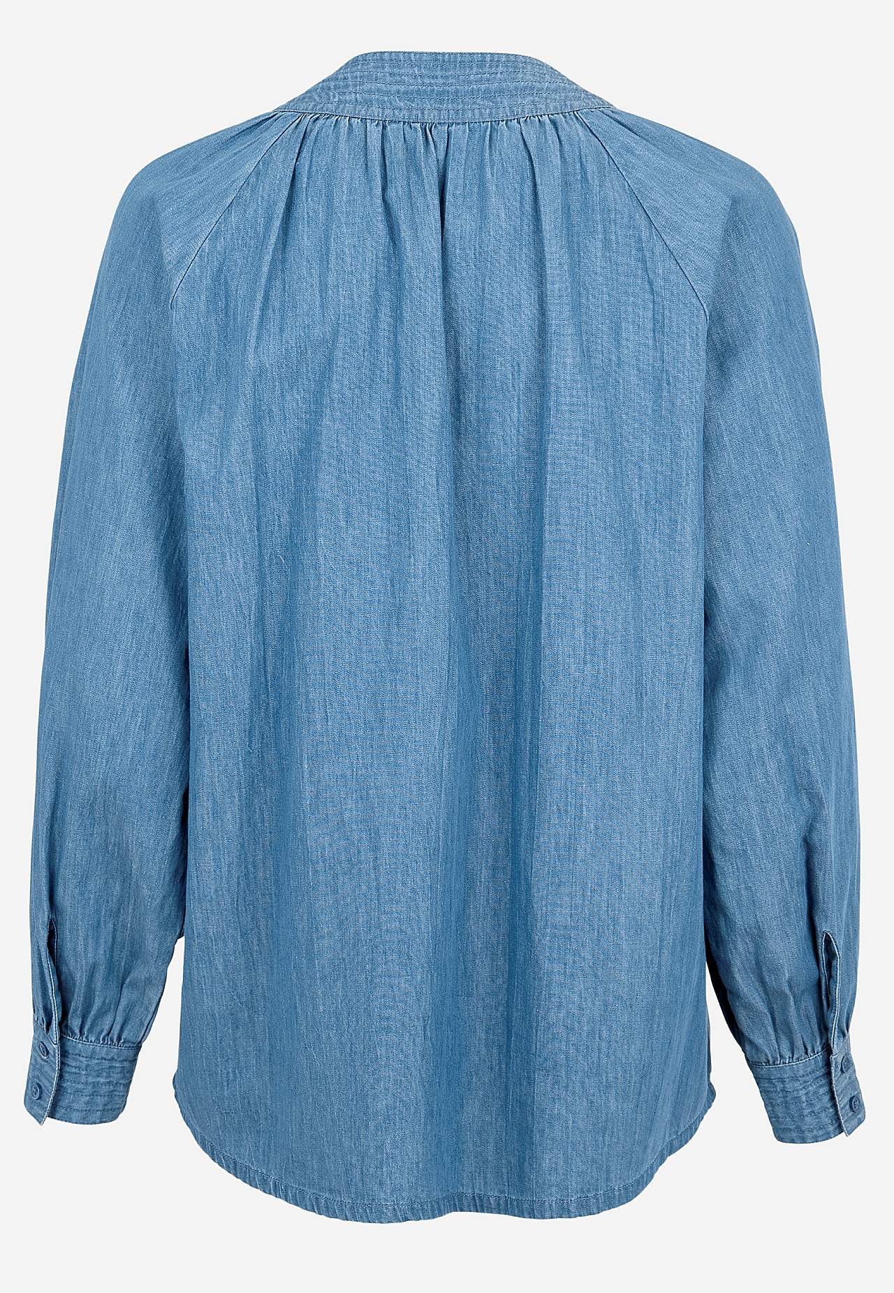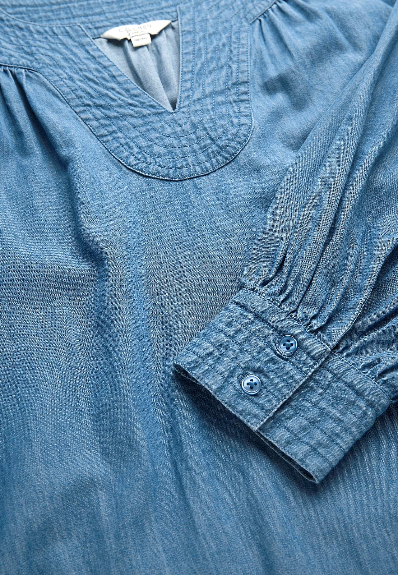 Tunika z lehce světlejší a příjemně měkké denimové kvality. Přírodní řasení s vzdušným pocitem. Volný a jemně tvarovaný do A střih. Kulatý krk se střihem do V a dekorativními prošíváními kolem dokola. Dlouhé a široké raglánové rukávy s manžetou na manžetách s dekorativními stehy a dvěma knoflíky. Zaoblený a mírně prodloužen... Přečtěte si více