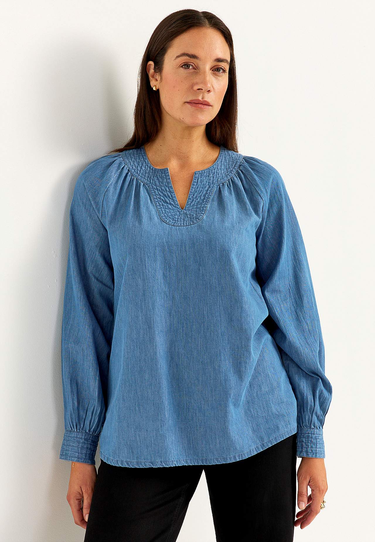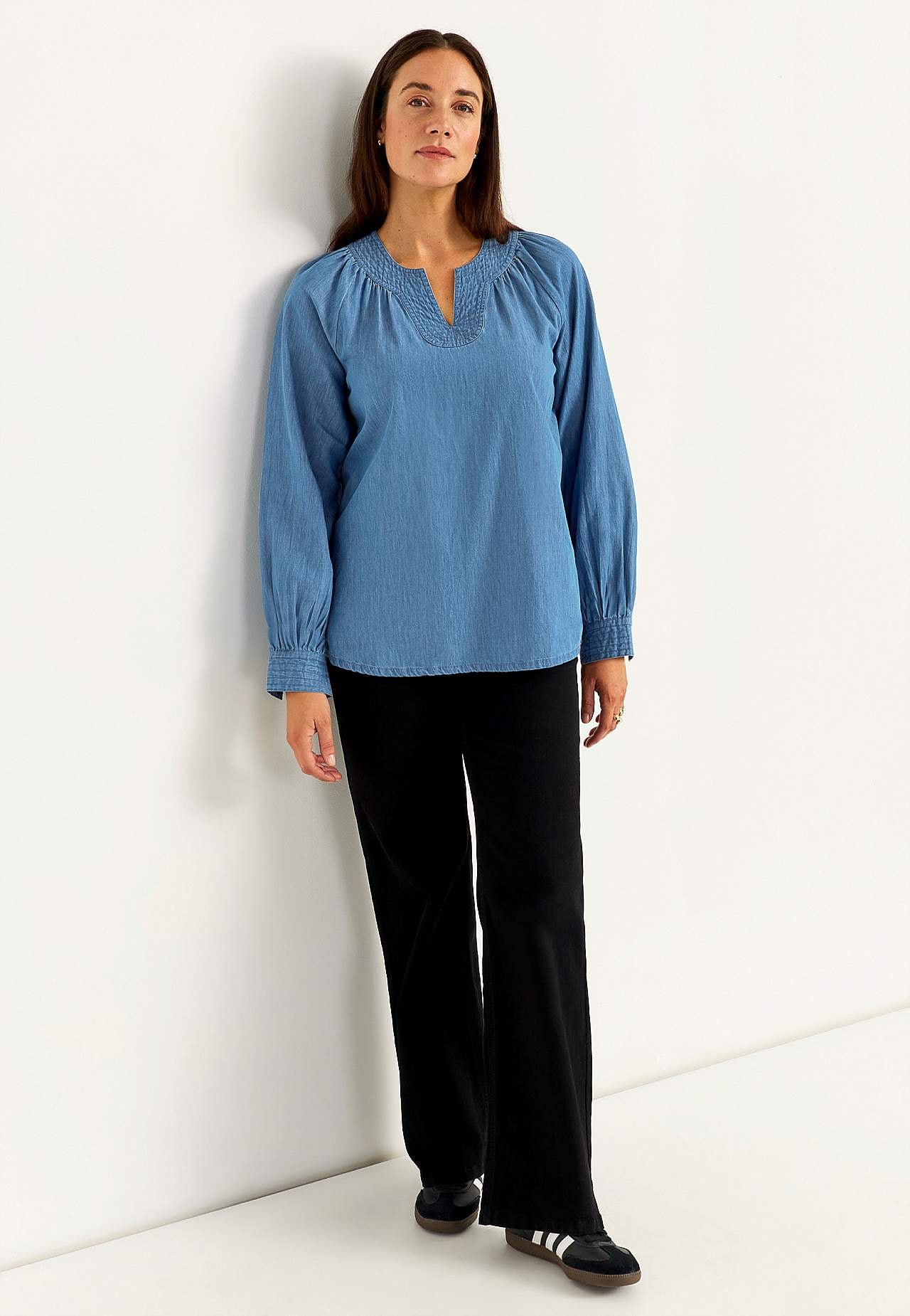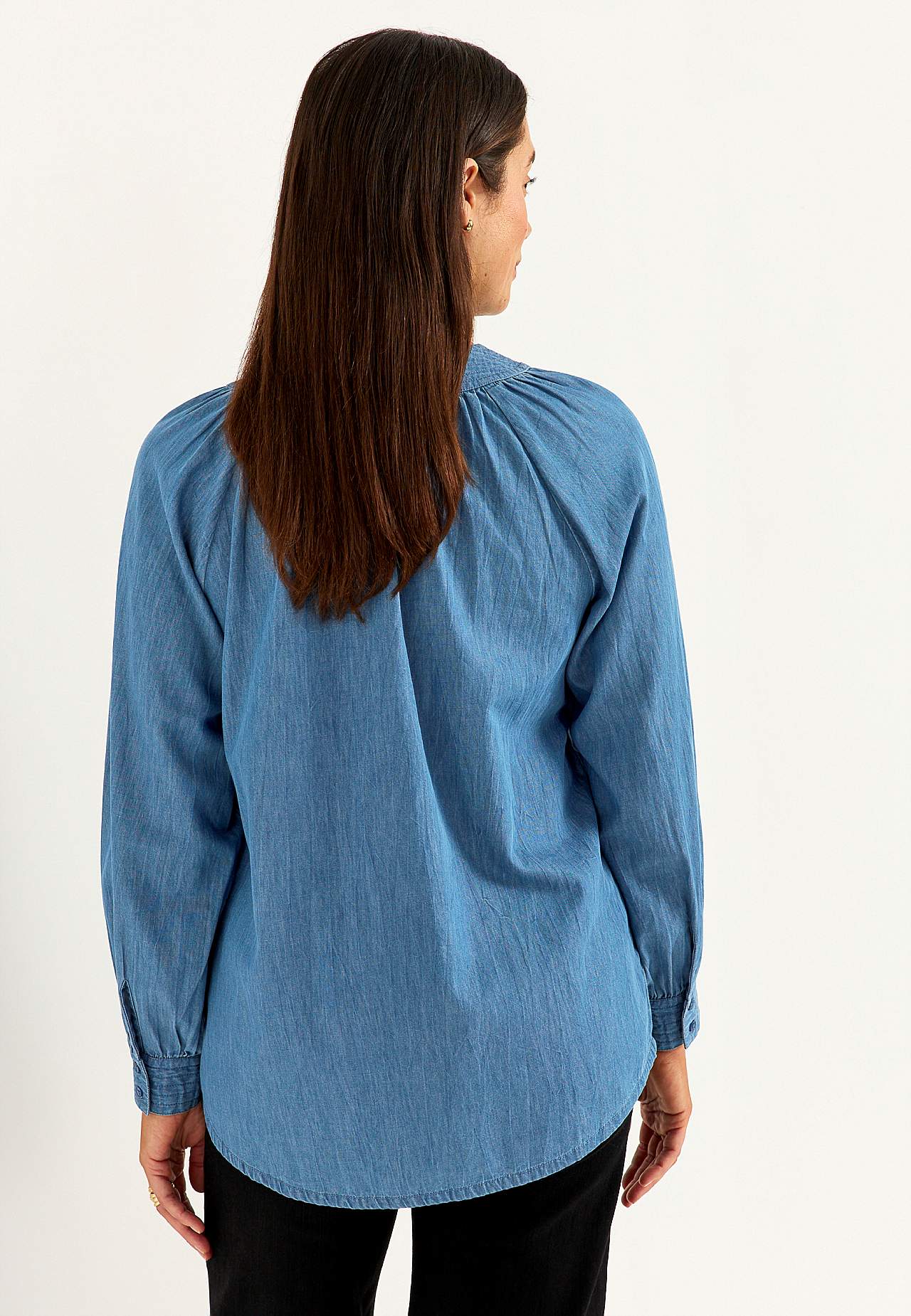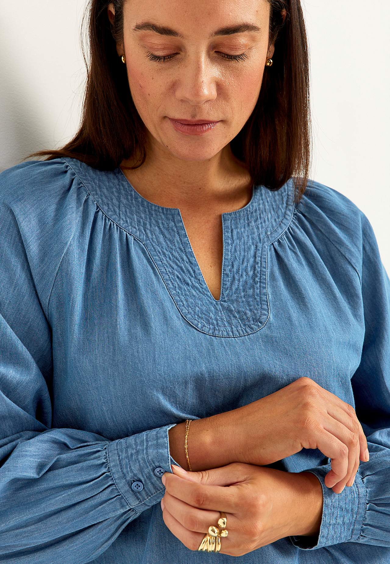 Tunika z lehce světlejší a příjemně měkké denimové kvality. Přírodní řasení s vzdušným pocitem. Volný a jemně tvarovaný do A střih. Kulatý krk se střihem do V a dekorativními prošíváními kolem dokola. Dlouhé a široké raglánové rukávy s manžetou na manžetách s dekorativními stehy a dvěma knoflíky. Zaoblený a mírně prodloužen... Přečtěte si více