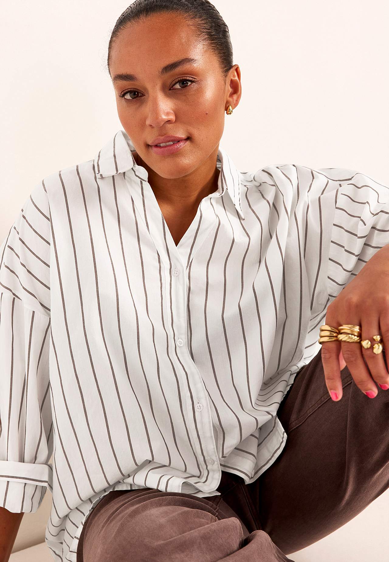 Delší košile s klasickým límcem a barevným a elegantním pruhem. Tkaný a měkký materiál s upraveným dotykem. Volný a ležérní střih. Klasický límec a lichotivý výstřih do V. Spadlé rameno. Model se zapínáním po celé délce. Sedlo vzadu. Dlouhé rukávy s manžetou a knoflíky. Zaoblený a mírně prodloužený v zadní části lem. Délka... Přečtěte si více