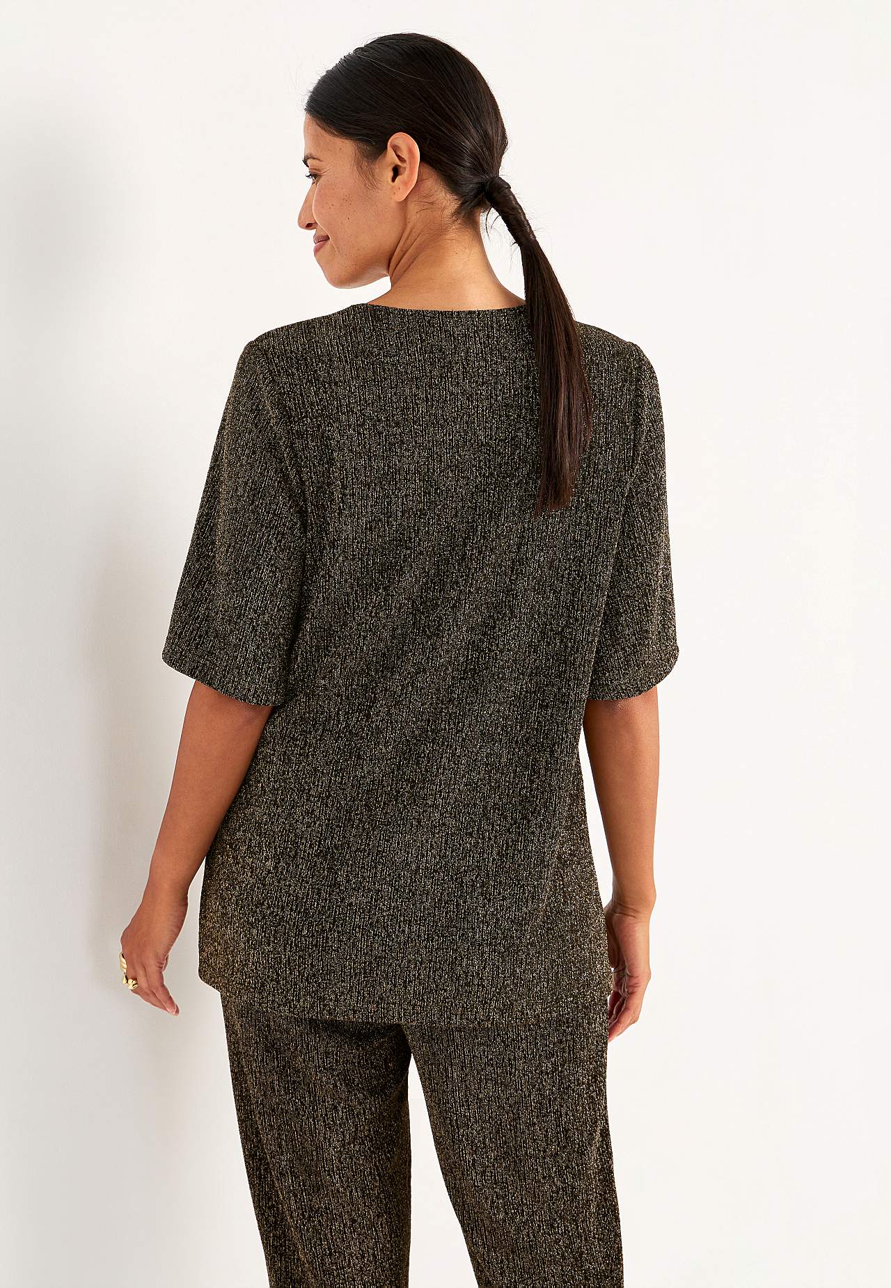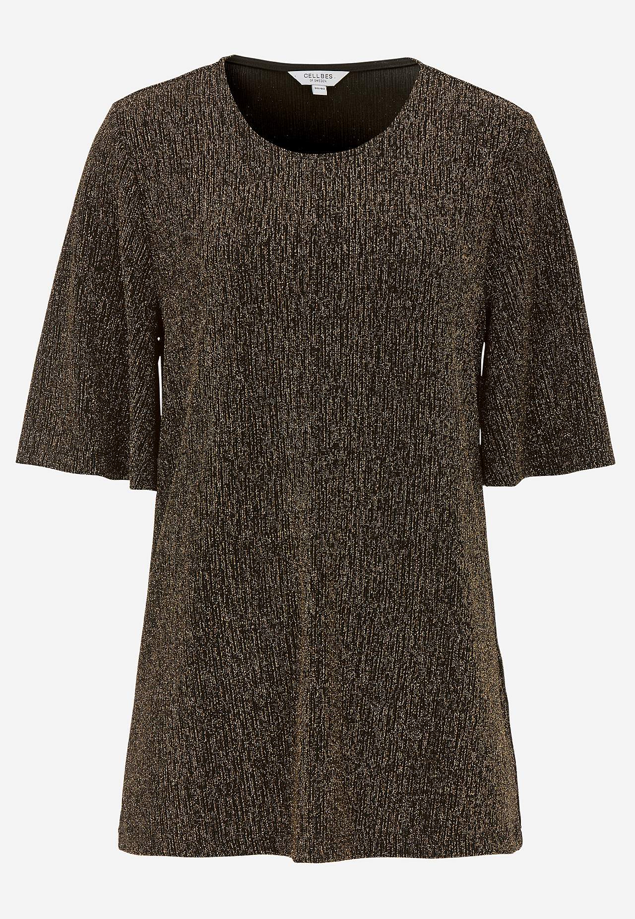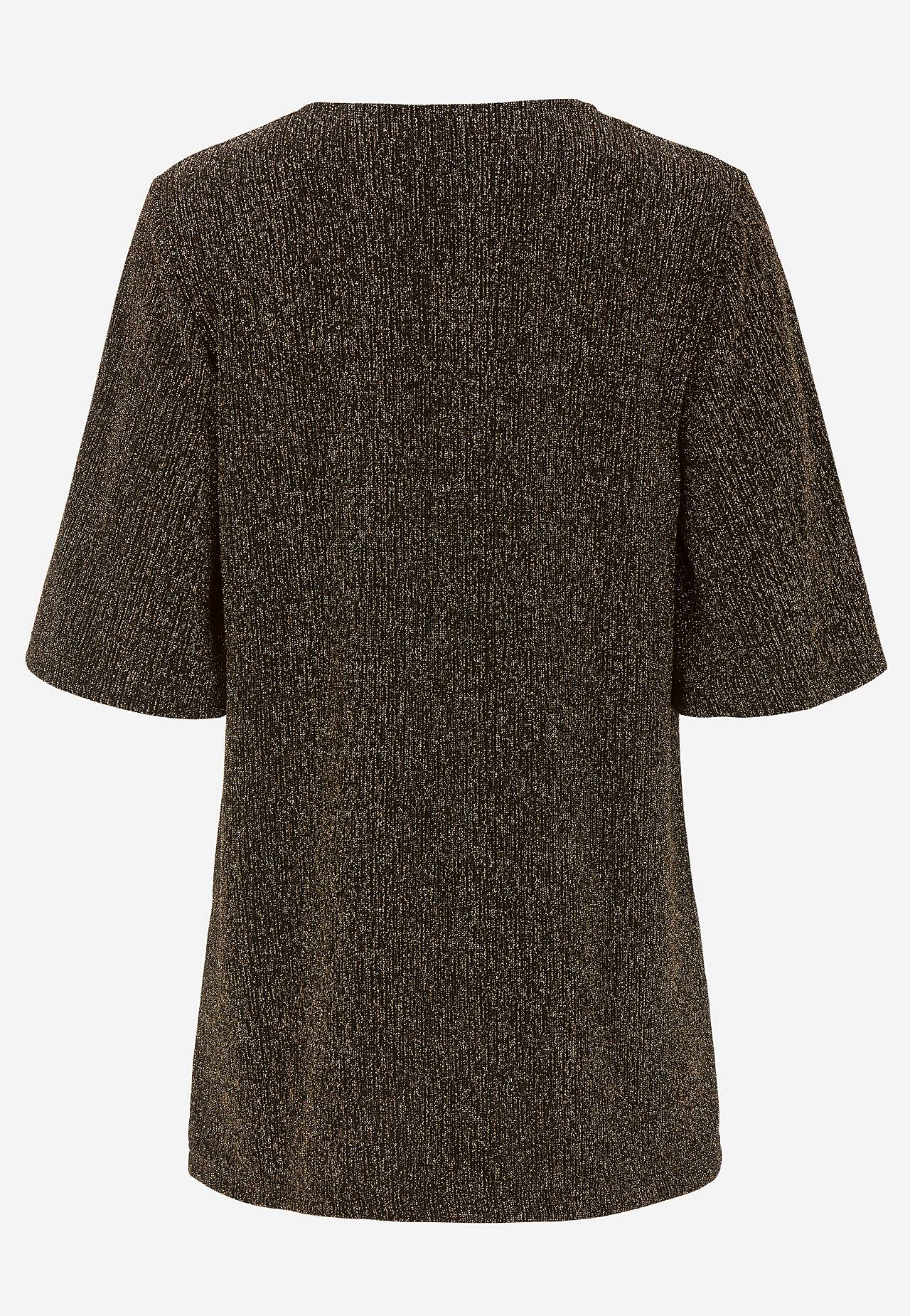 Třpytivá žerzejová tunika ideální na oslavy. Střih do A. Měkký a roztažitelný materiál s třpytivými vlákny. Kulatý výstřih. Raglanové rukávy s hezkou šířkou a 3/4 délkou. Lehce zaoblený lem. Délka se odvíjí od velikosti, cca 71-88 cm.