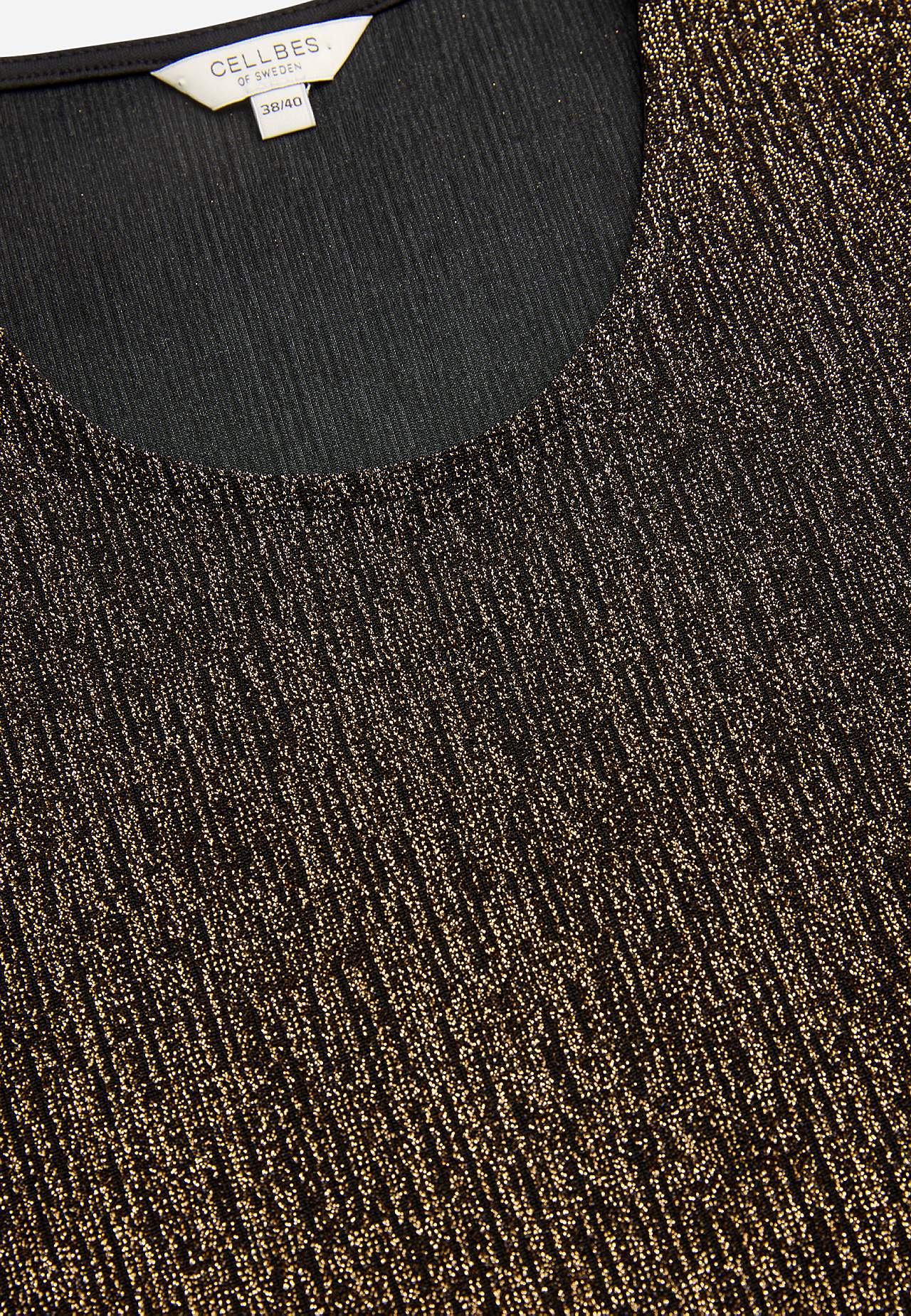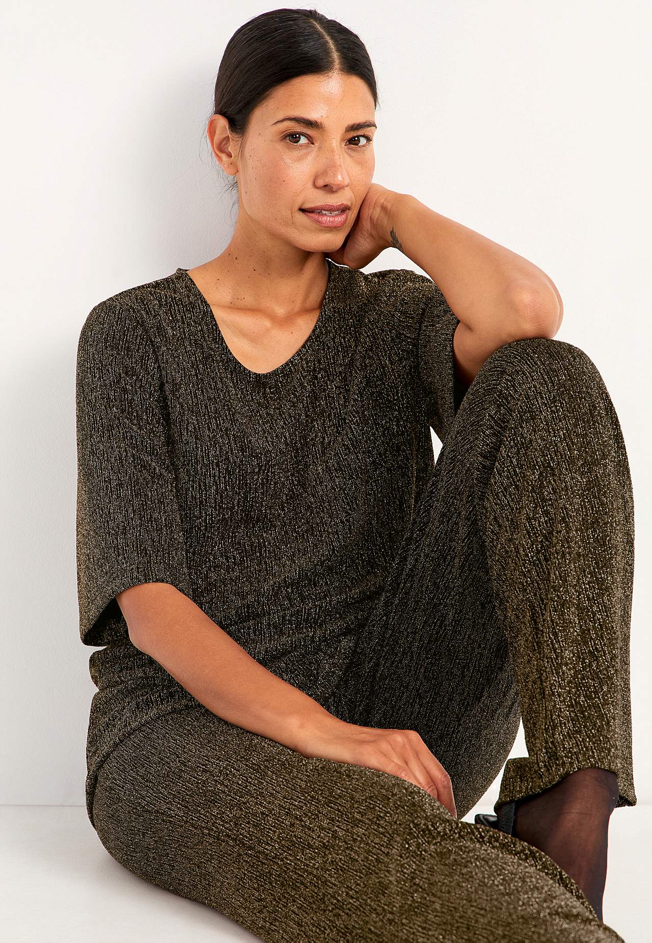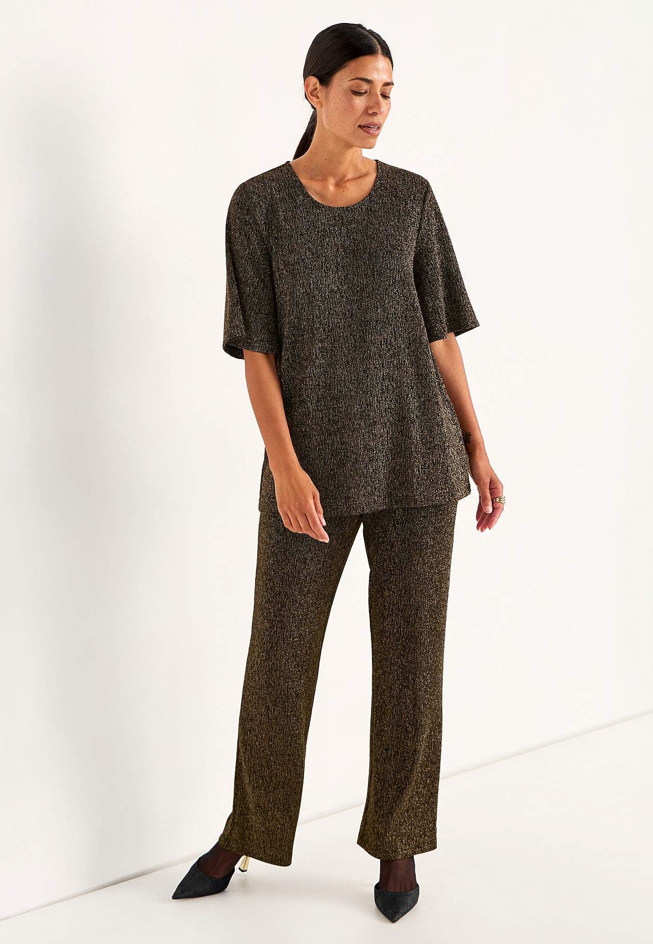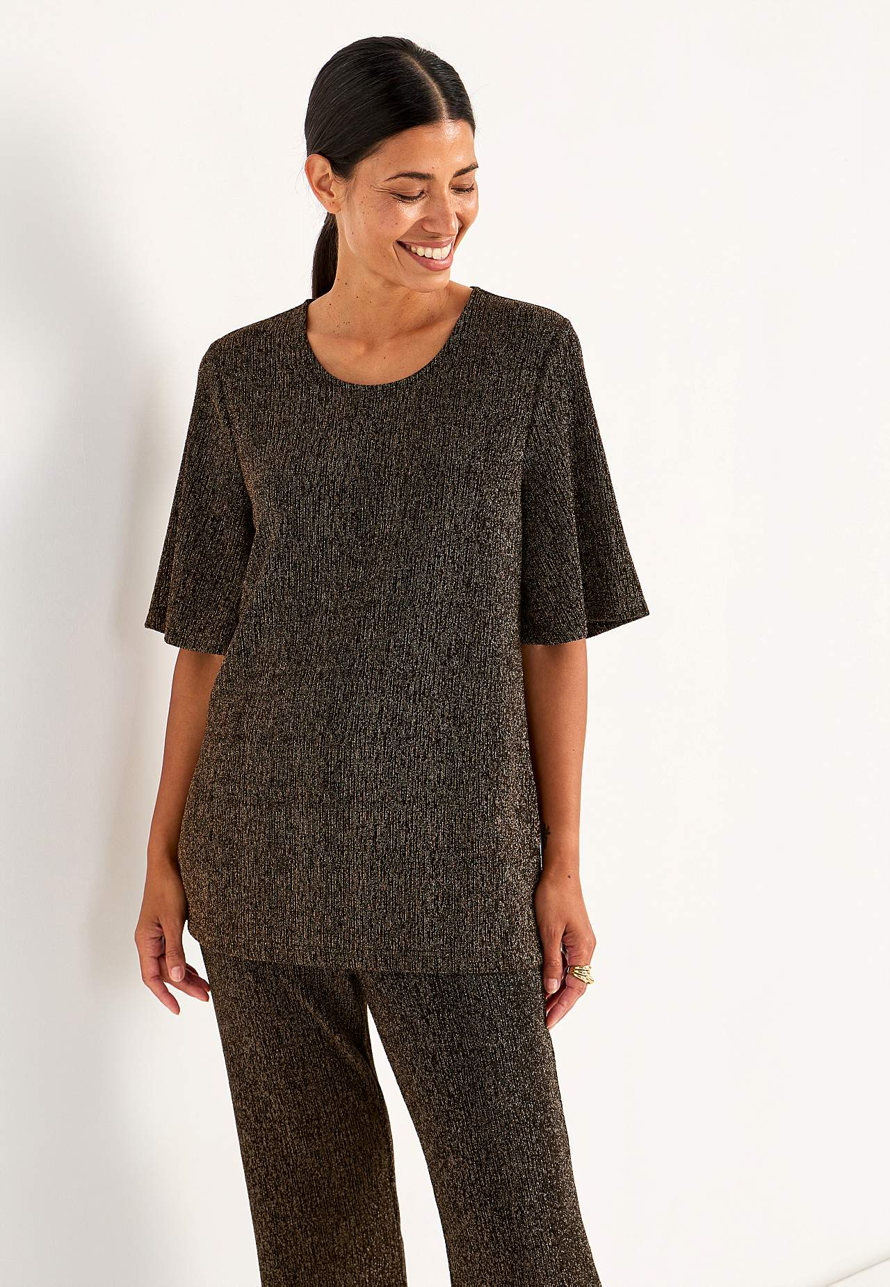 Třpytivá žerzejová tunika ideální na oslavy. Střih do A. Měkký a roztažitelný materiál s třpytivými vlákny. Kulatý výstřih. Raglanové rukávy s hezkou šířkou a 3/4 délkou. Lehce zaoblený lem. Délka se odvíjí od velikosti, cca 71-88 cm.
