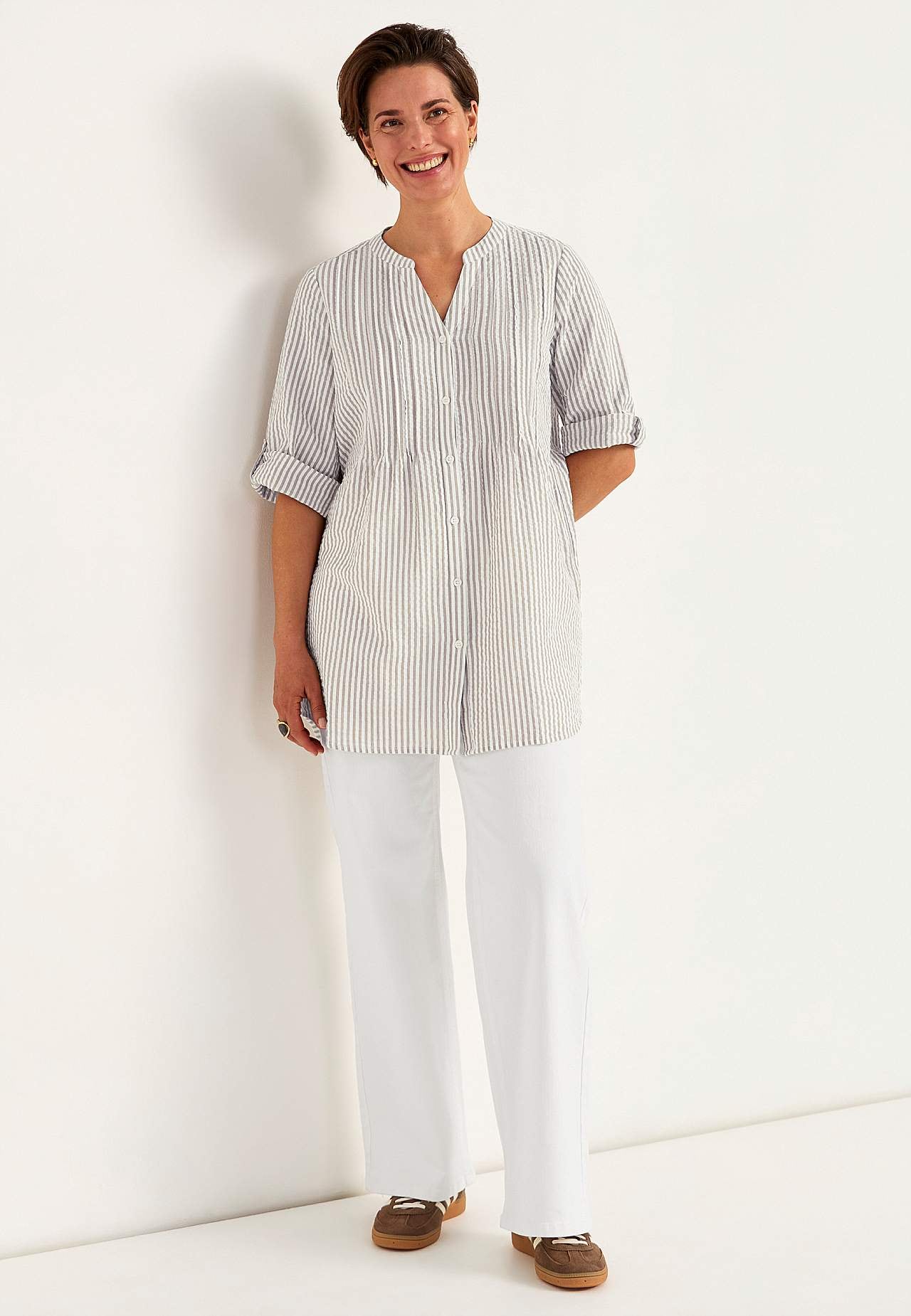 Vzdušná dlouhá košile s ozdobným sámkem. Půvabný materiál ze seersucker. Kulatý výstřih s rozepínáním do V. Zapínání na knoflíky. Široký ohrnutý rukáv s knoflíkem s 3/4 délkou. Skryté kapsy na straně. Sedlo vzadu s nabíráními. Vzadu sedlo. Délka se odvíjí od velikosti, cca 82-94 cm od ramene.